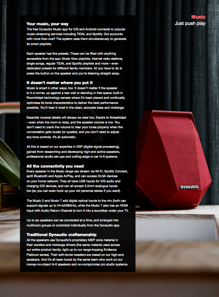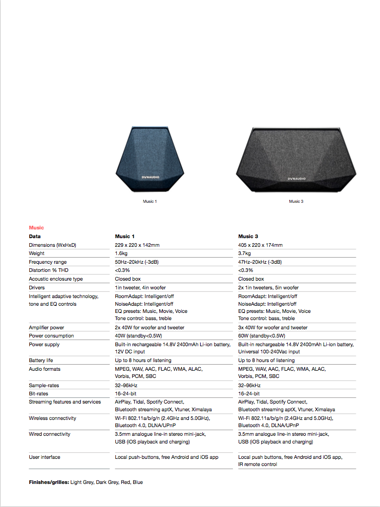 4 coloris différents seront proposés : le gris chiné du plus bel effet, le rouge, le gris foncé et le bleu. Dés le mois de Novembre 2017. La gamme Dynaudio Music sera pilotée par une application iOS et Android, des boutons sur la tranche des enceintes et une télécommande infrarouge.