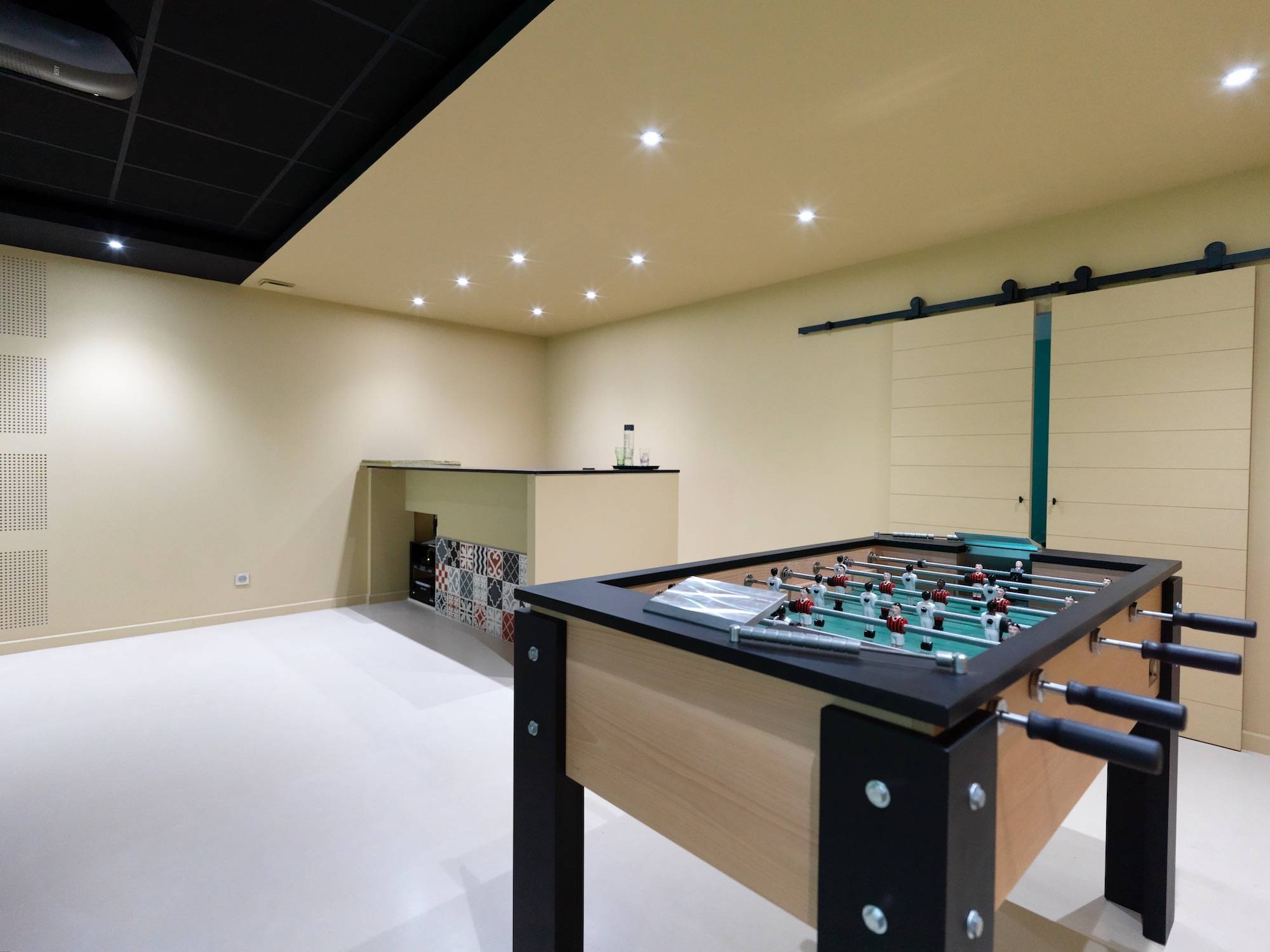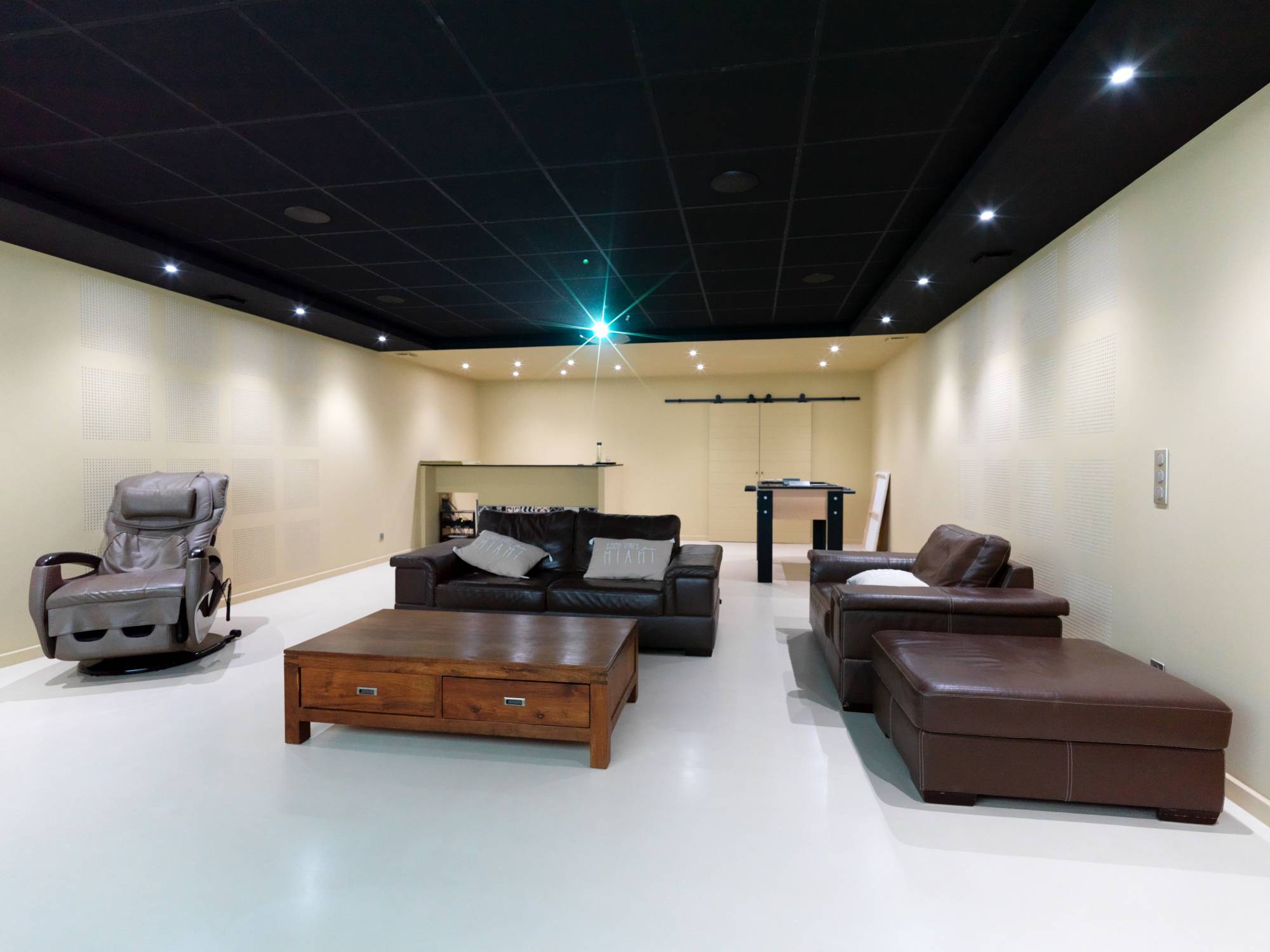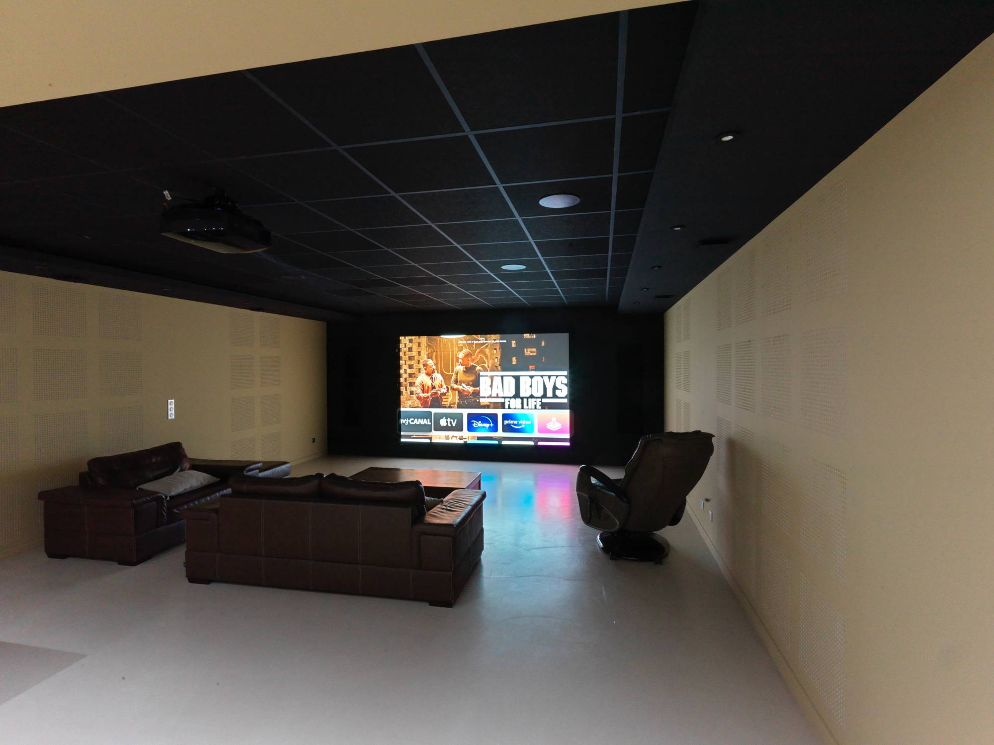 La mission confiée par notre client cette fois-ci, était d'intégrer un bel écran de projection de 3 mètres de base et microperforé pour laisser passer le son tout en offrant une qualité d'image irréprochable.