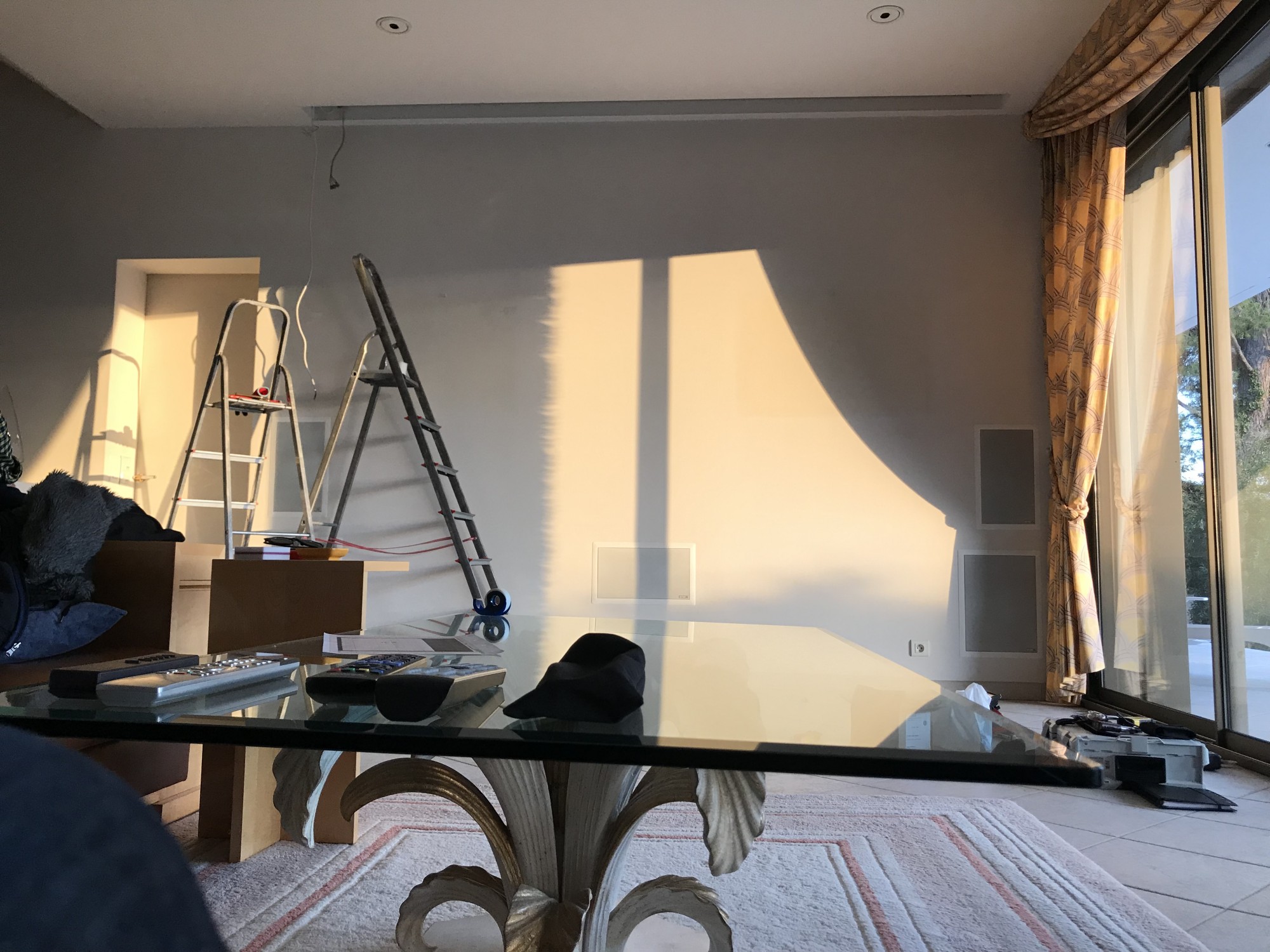 La demande client était l'installation dans une très belle villa marseillaise d'un écran de projection sur mesure (format 1,85:1) tensionné électrique dans une niche en plafond.