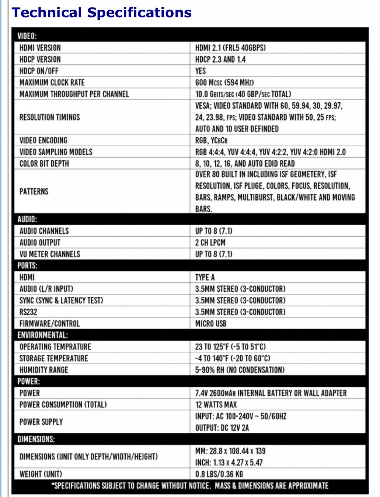 L'appareil de poche est portable grâce à une batterie intégrée et peut générer plus de 100 mires différentes pour la configuration, l'étalonnage et le dépannage. Il dispose d'un écran couleur de trois pouces avec des menus simplifiés ainsi que d'un logiciel de contrôle PC gratuit. Le 8K SIX-G dispose également de la détection Hot Plug, de la fonctionnalité de lecture/écriture EDID et de la possibilité de créer des résolutions personnalisées. Il est possible de choisir entre le contrôle RS232 ou USB et la prise en charge des logiciels d'étalonnage Calman et Light Illusion. Le 8K SIX-G est le seul appareil à proposer la suite complète de mires ISF, un niveau de sortie couleur sélectionnable, des triplets RVB et un APL (Average Picture Level) constant, le tout en un seul endroit. Le 8K SIX-G est le rêve de tout étalonneur car il est certifié ISF Labs, le micrologiciel peut être mis à jour sur le terrain et il inclut même des tests de confiance audio.