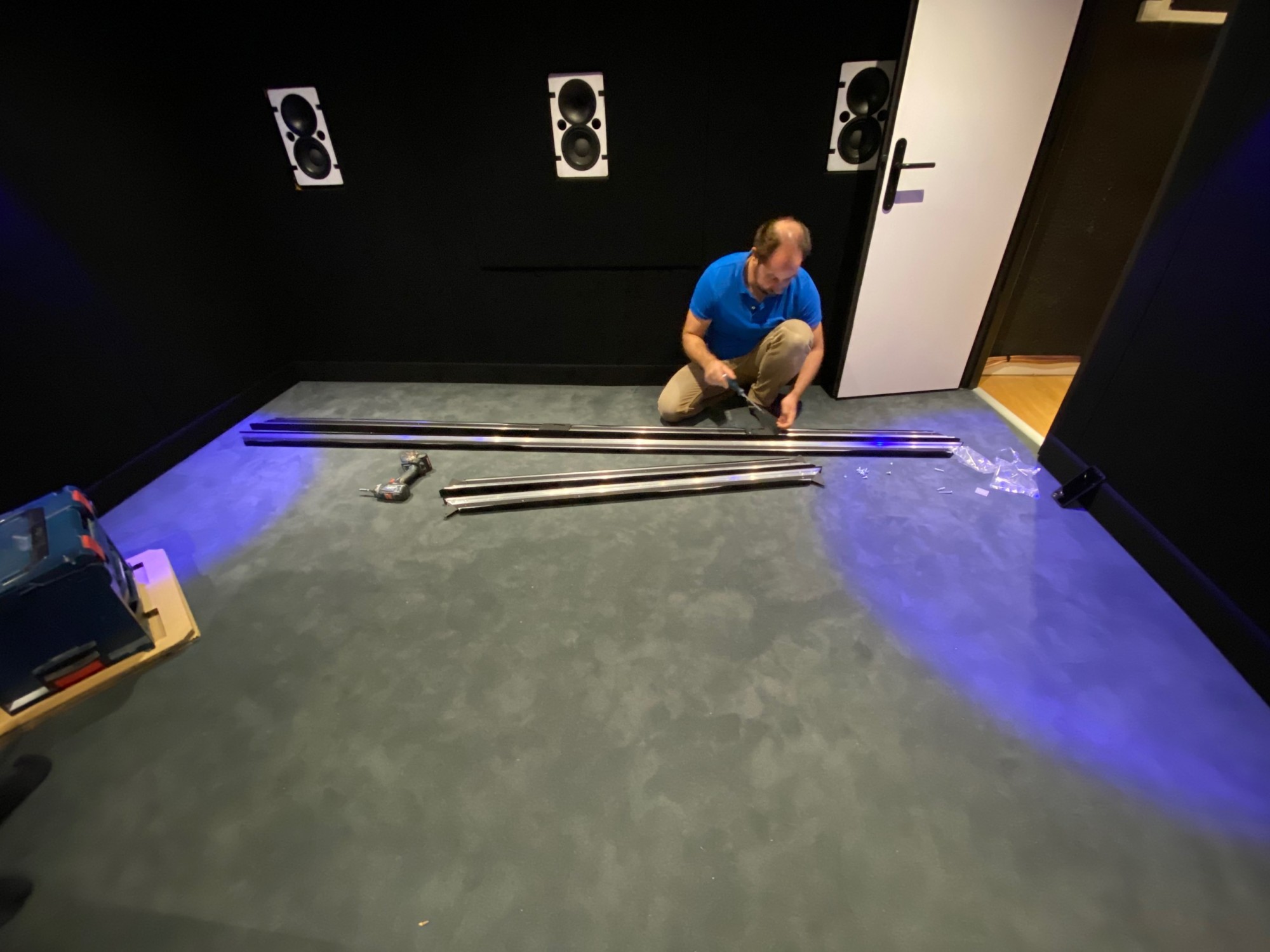 Session de réglage audio avant et après la pose de l’écran de projection.