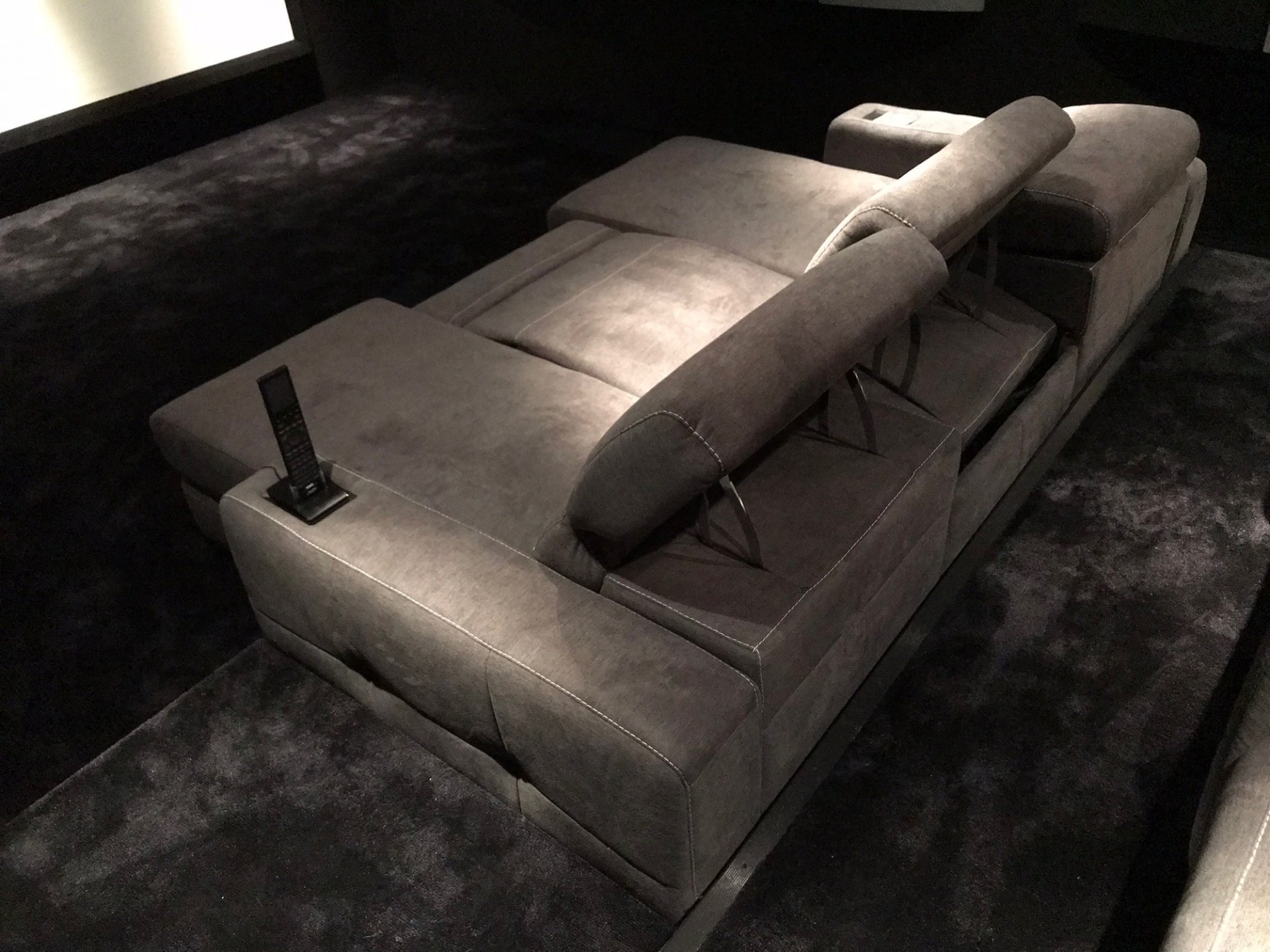 L’acoustique initiale était une des fondations de cette salle de cinéma privé. 100% de surfaces recouvertes de traitement acoustique.