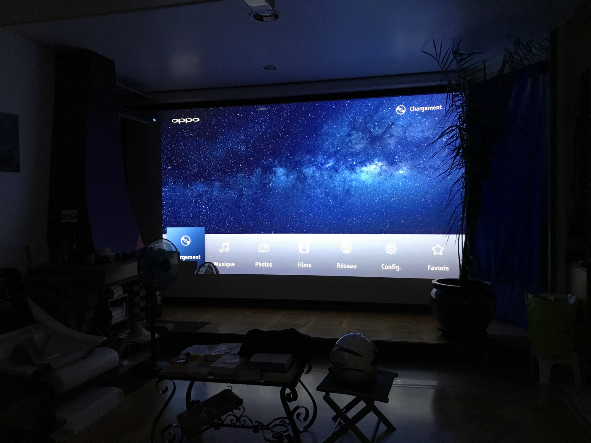 installation d'un vidéo projecteur Sony dans un salon sur un écran de 3,70 m.